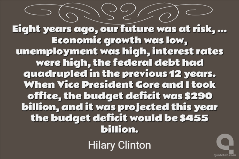 Eight years ago, our future was at risk, ... Economic growth was low, unemployment was high, interest rates were high, the federal debt had quadrupled in the previous 12 years. When Vice President Gore and I took office, the budget deficit was $290 billion, and it was projected this year the budget deficit would be $455 billion.