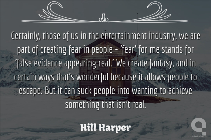 Certainly, those of us in the entertainment industry, we are part of creating fear in people - 'fear' for me stands for 'false evidence appearing real.' We create fantasy, and in certain ways that's wonderful because it allows people to escape. But it can suck people into wanting to achieve something that isn't real.