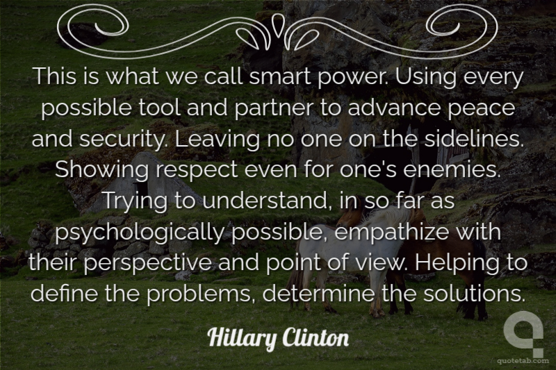 This is what we call smart power. Using every possible tool and partner to advance peace and security. Leaving no one on the sidelines. Showing respect even for one's enemies. Trying to understand, in so far as psychologically possible, empathize with their perspective and point of view. Helping to define the problems, determine the solutions.