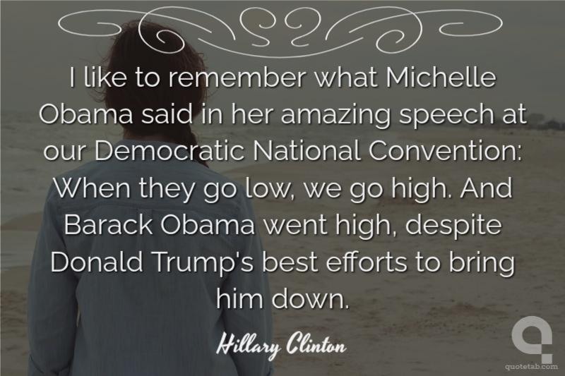I like to remember what Michelle Obama said in her amazing speech at our Democratic National Convention: When they go low, we go high. And Barack Obama went high, despite Donald Trump's best efforts to bring him down.