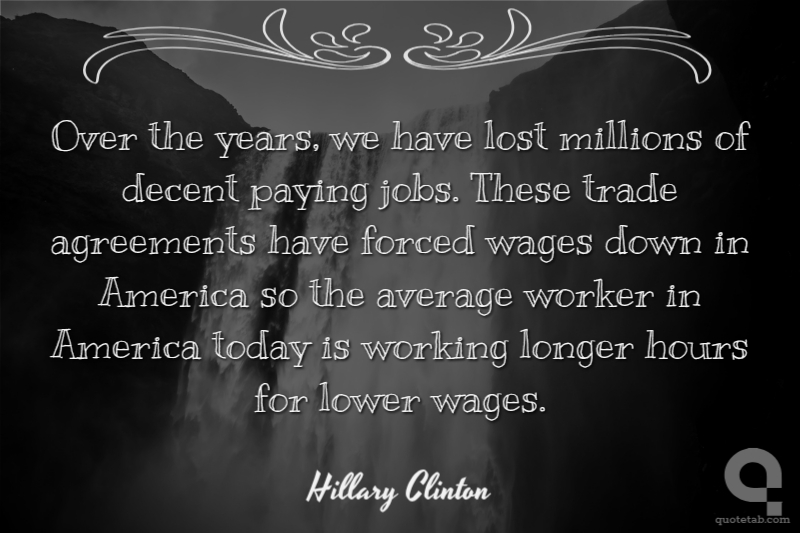 Over the years, we have lost millions of decent paying jobs. These trade agreements have forced wages down in America so the average worker in America today is working longer hours for lower wages.