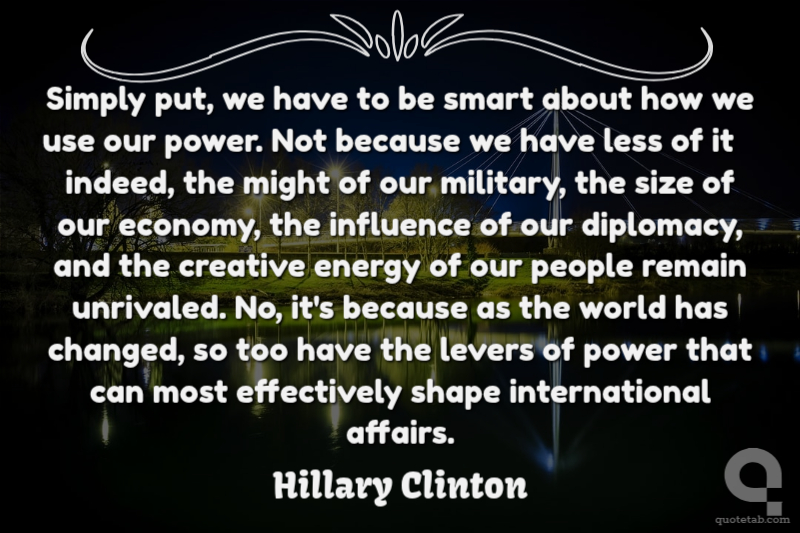 Simply put, we have to be smart about how we use our power. Not because we have less of it indeed, the might of our military, the size of our economy, the influence of our diplomacy, and the creative energy of our people remain unrivaled. No, it's because as the world has changed, so too have the levers of power that can most effectively shape international affairs.