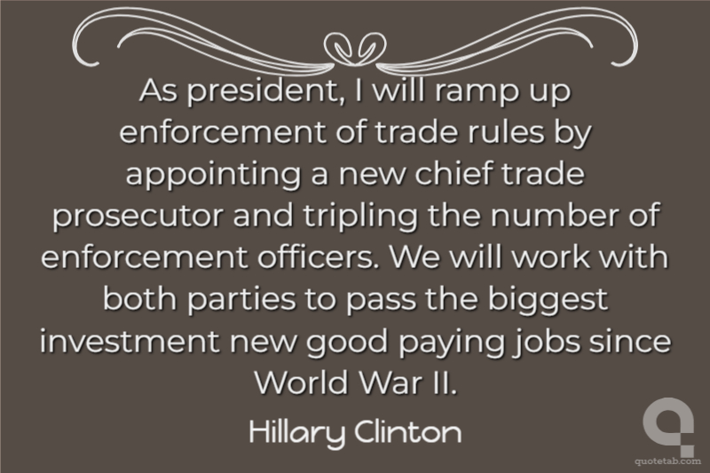 As president, I will ramp up enforcement of trade rules by appointing a new chief trade prosecutor and tripling the number of enforcement officers. We will work with both parties to pass the biggest investment new good paying jobs since World War II.