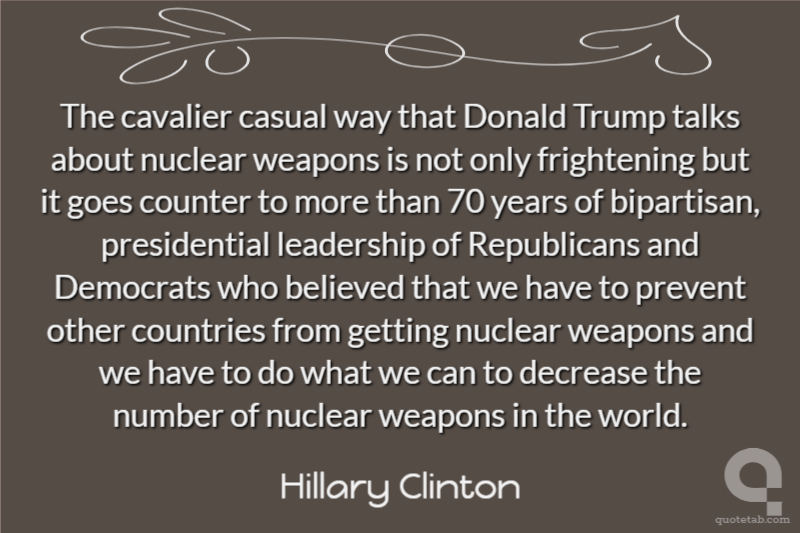 The cavalier casual way that Donald Trump talks about nuclear weapons is not only frightening but it goes counter to more than 70 years of bipartisan, presidential leadership of Republicans and Democrats who believed that we have to prevent other countries from getting nuclear weapons and we have to do what we can to decrease the number of nuclear weapons in the world.