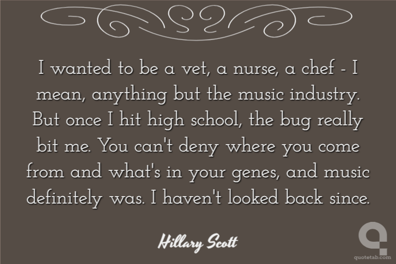I wanted to be a vet, a nurse, a chef - I mean, anything but the music industry. But once I hit high school, the bug really bit me. You can't deny where you come from and what's in your genes, and music definitely was. I haven't looked back since.