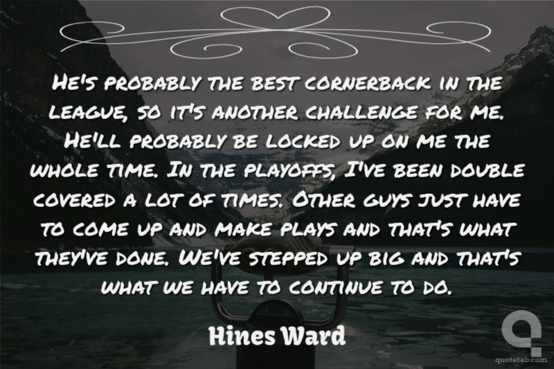 He's probably the best cornerback in the league, so it's another challenge for me. He'll probably be locked up on me the whole time. In the playoffs, I've been double covered a lot of times. Other guys just have to come up and make plays and that's what they've done. We've stepped up big and that's what we have to continue to do.