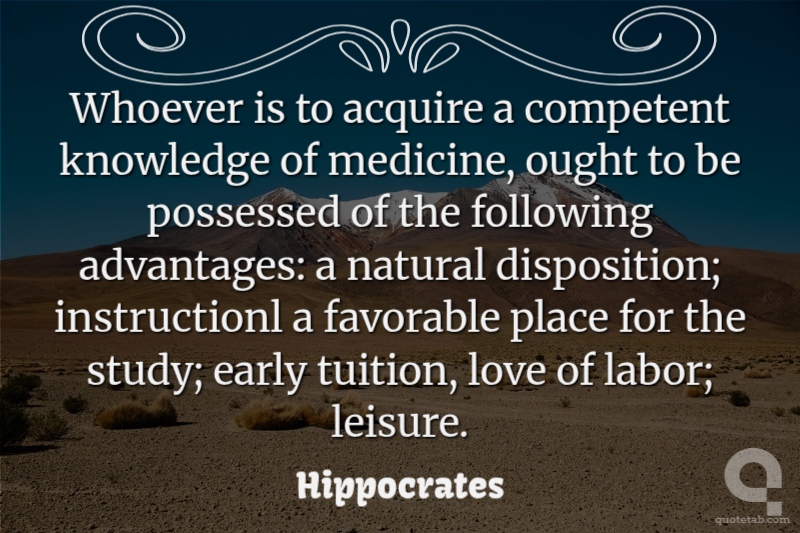 Whoever is to acquire a competent knowledge of medicine, ought to be possessed of the following advantages: a natural disposition; instructionl a favorable place for the study; early tuition, love of labor; leisure.