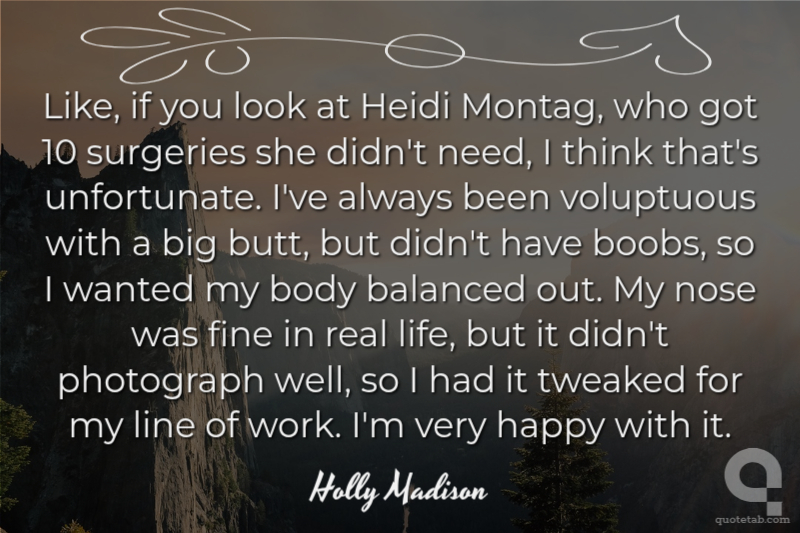 Like, if you look at Heidi Montag, who got 10 surgeries she didn't need, I think that's unfortunate. I've always been voluptuous with a big butt, but didn't have boobs, so I wanted my body balanced out. My nose was fine in real life, but it didn't photograph well, so I had it tweaked for my line of work. I'm very happy with it.