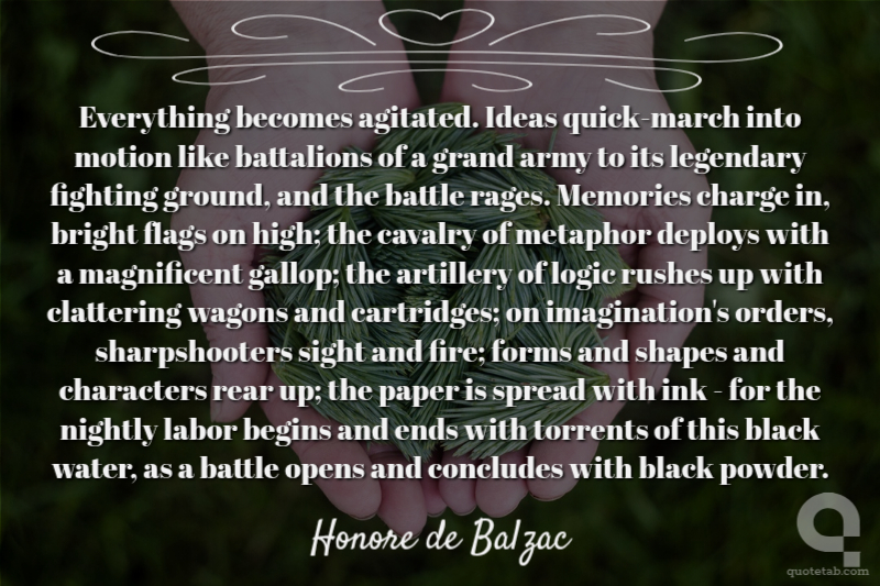 Everything becomes agitated. Ideas quick-march into motion like battalions of a grand army to its legendary fighting ground, and the battle rages. Memories charge in, bright flags on high; the cavalry of metaphor deploys with a magnificent gallop; the artillery of logic rushes up with clattering wagons and cartridges; on imagination's orders, sharpshooters sight and fire; forms and shapes and characters rear up; the paper is spread with ink - for the nightly labor begins and ends with torrents of this black water, as a battle opens and concludes with black powder.