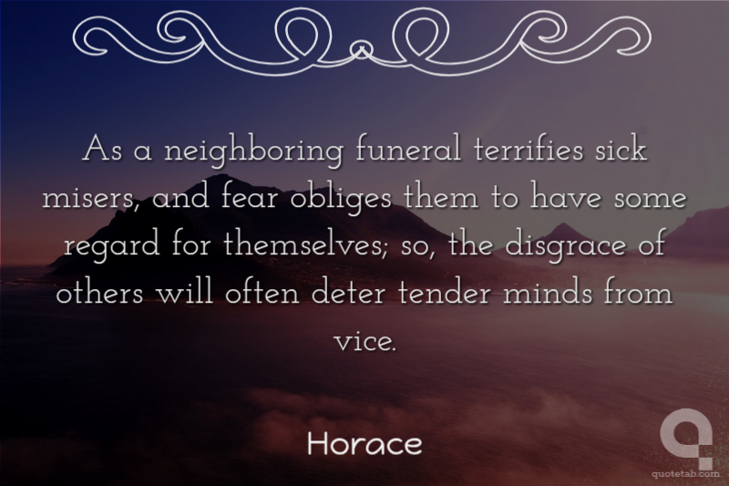 As a neighboring funeral terrifies sick misers, and fear obliges them to have some regard for themselves; so, the disgrace of others will often deter tender minds from vice.