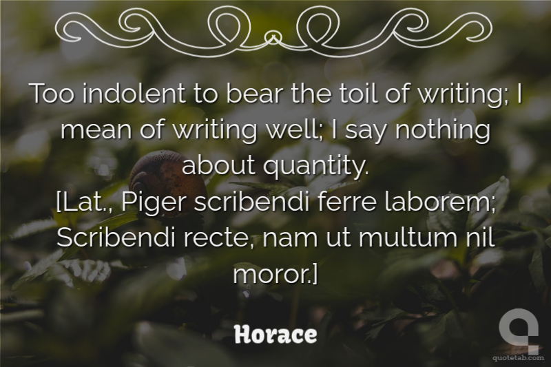 Too indolent to bear the toil of writing; I mean of writing well; I say nothing about quantity. [Lat., Piger scribendi ferre laborem; Scribendi recte, nam ut multum nil moror.]