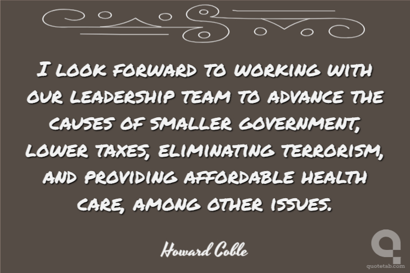 I look forward to working with our leadership team to advance the causes of smaller government, lower taxes, eliminating terrorism, and providing affordable health care, among other issues.