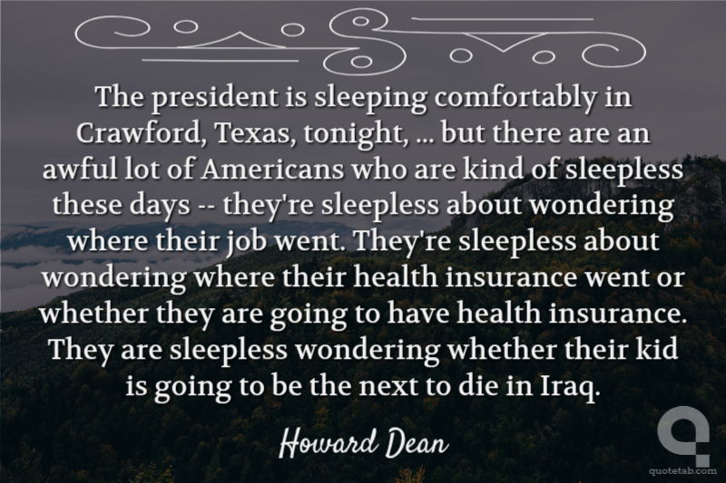 The president is sleeping comfortably in Crawford, Texas, tonight, ... but there are an awful lot of Americans who are kind of sleepless these days -- they're sleepless about wondering where their job went. They're sleepless about wondering where their health insurance went or whether they are going to have health insurance. They are sleepless wondering whether their kid is going to be the next to die in Iraq.