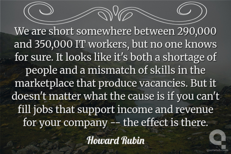 We are short somewhere between 290,000 and 350,000 IT workers, but no one knows for sure. It looks like it's both a shortage of people and a mismatch of skills in the marketplace that produce vacancies. But it doesn't matter what the cause is if you can't fill jobs that support income and revenue for your company -- the effect is there.