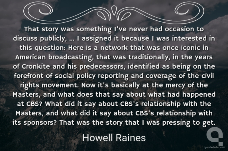 That story was something I've never had occasion to discuss publicly, ... I assigned it because I was interested in this question: Here is a network that was once iconic in American broadcasting, that was traditionally, in the years of Cronkite and his predecessors, identified as being on the forefront of social policy reporting and coverage of the civil rights movement. Now it's basically at the mercy of the Masters, and what does that say about what had happened at CBS? What did it say about CBS's relationship with the Masters, and what did it say about CBS's relationship with its sponsors? That was the story that I was pressing to get.