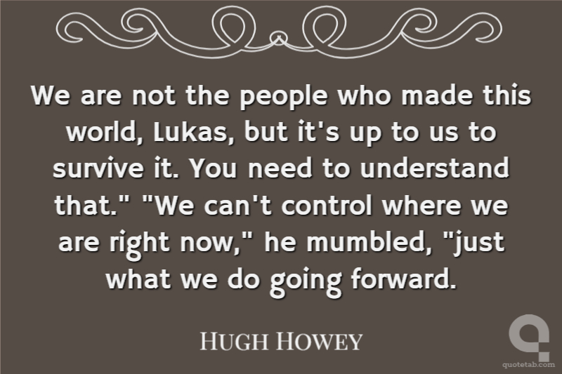 We are not the people who made this world, Lukas, but it's up to us to survive it. You need to understand that." "We can't control where we are right now," he mumbled, "just what we do going forward.