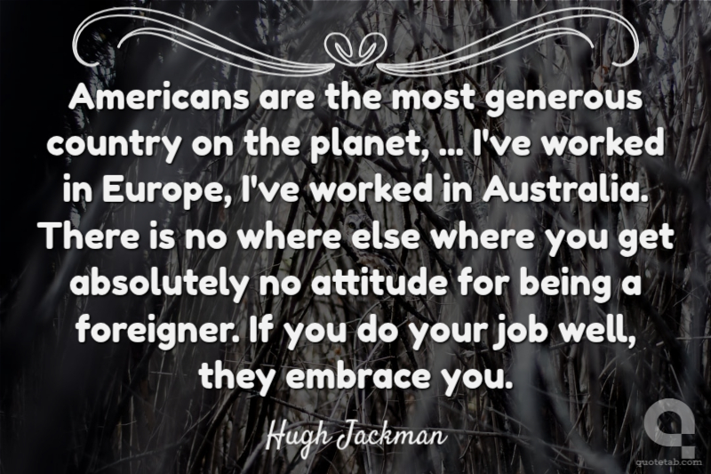 Americans are the most generous country on the planet, ... I've worked in Europe, I've worked in Australia. There is no where else where you get absolutely no attitude for being a foreigner. If you do your job well, they embrace you.