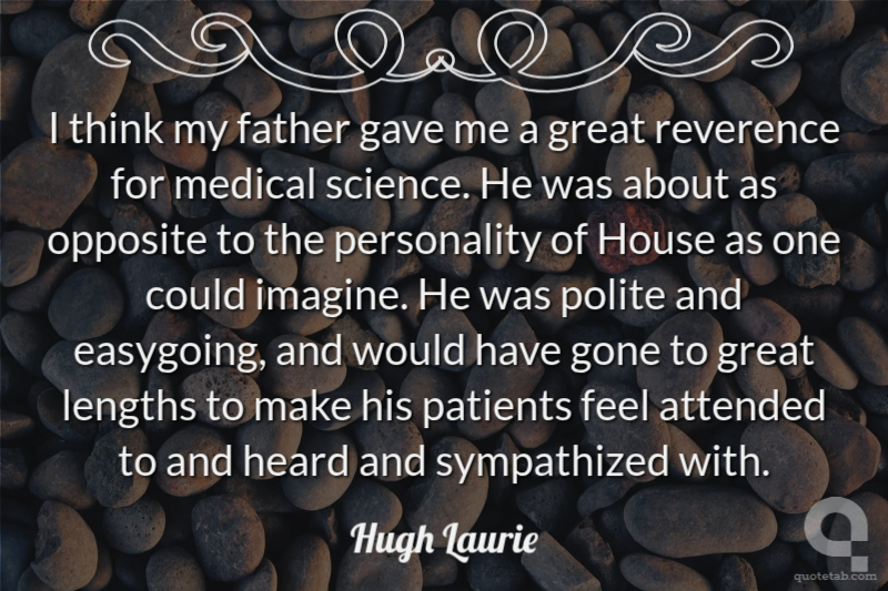 I think my father gave me a great reverence for medical science. He was about as opposite to the personality of House as one could imagine. He was polite and easygoing, and would have gone to great lengths to make his patients feel attended to and heard and sympathized with.
