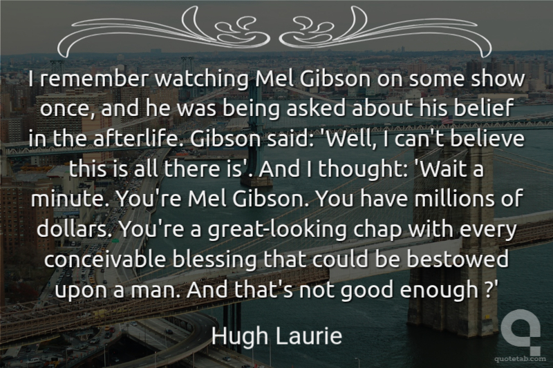 I remember watching Mel Gibson on some show once, and he was being asked about his belief in the afterlife. Gibson said: 'Well, I can't believe this is all there is'. And I thought: 'Wait a minute. You're Mel Gibson. You have millions of dollars. You're a great-looking chap with every conceivable blessing that could be bestowed upon a man. And that's not good enough ?'