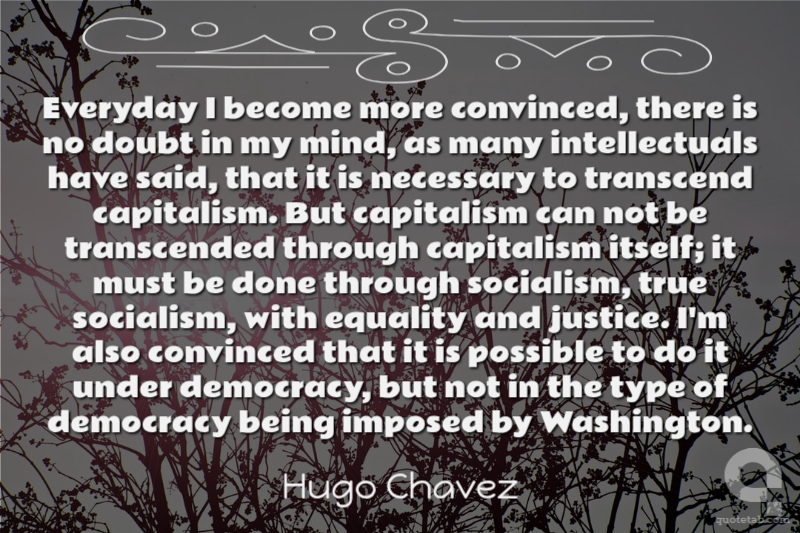 Everyday I become more convinced, there is no doubt in my mind, as many intellectuals have said, that it is necessary to transcend capitalism. But capitalism can not be transcended through capitalism itself; it must be done through socialism, true socialism, with equality and justice. I'm also convinced that it is possible to do it under democracy, but not in the type of democracy being imposed by Washington.