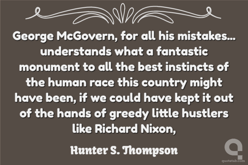 George McGovern, for all his mistakes... understands what a fantastic monument to all the best instincts of the human race this country might have been, if we could have kept it out of the hands of greedy little hustlers like Richard Nixon,