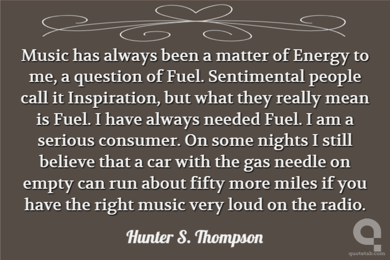 Music has always been a matter of Energy to me, a question of Fuel. Sentimental people call it Inspiration, but what they really mean is Fuel. I have always needed Fuel. I am a serious consumer. On some nights I still believe that a car with the gas needle on empty can run about fifty more miles if you have the right music very loud on the radio.