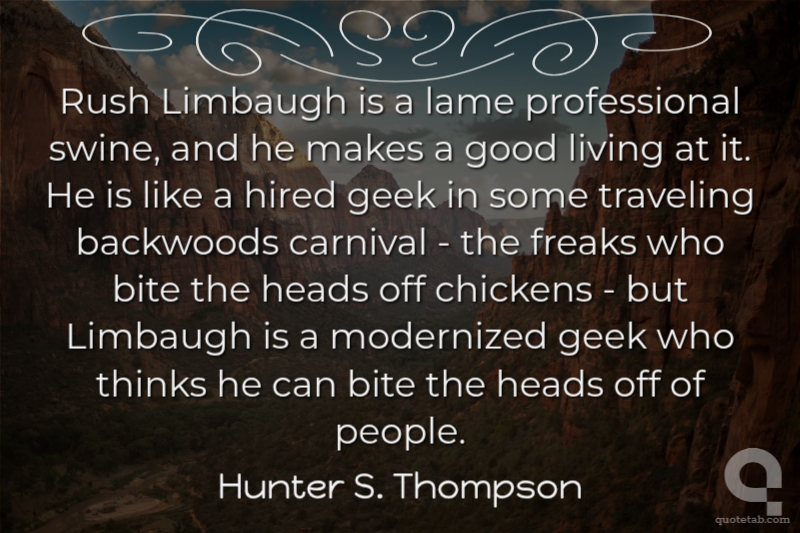 Rush Limbaugh is a lame professional swine, and he makes a good living at it. He is like a hired geek in some traveling backwoods carnival - the freaks who bite the heads off chickens - but Limbaugh is a modernized geek who thinks he can bite the heads off of people.