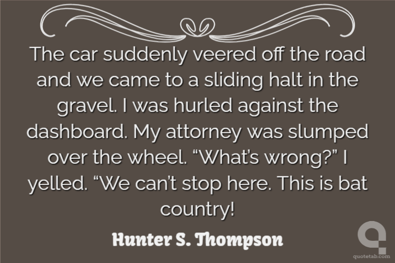 The car suddenly veered off the road and we came to a sliding halt in the gravel. I was hurled against the dashboard. My attorney was slumped over the wheel. “What’s wrong?” I yelled. “We can’t stop here. This is bat country!