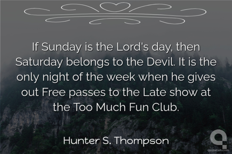 If Sunday is the Lord's day, then Saturday belongs to the Devil. It is the only night of the week when he gives out Free passes to the Late show at the Too Much Fun Club.