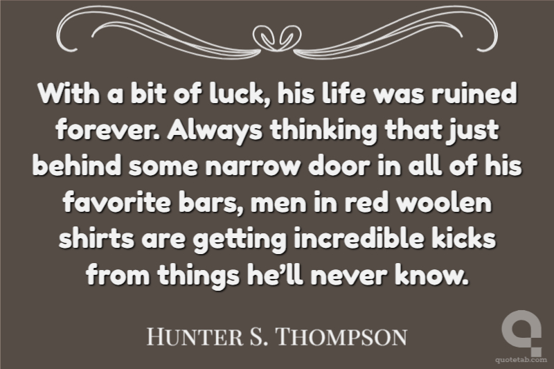 With a bit of luck, his life was ruined forever. Always thinking that just behind some narrow door in all of his favorite bars, men in red woolen shirts are getting incredible kicks from things he’ll never know.
