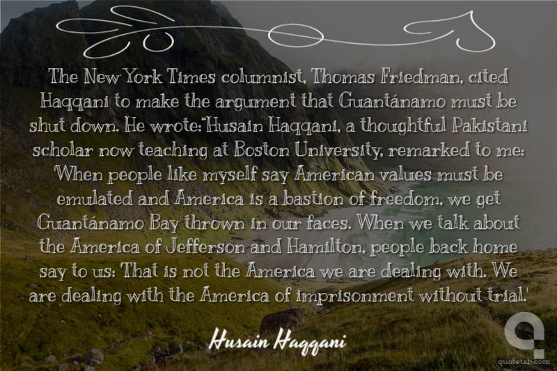 The New York Times columnist, Thomas Friedman, cited Haqqani to make the argument that Guantánamo must be shut down. He wrote:“Husain Haqqani, a thoughtful Pakistani scholar now teaching at Boston University, remarked to me: 'When people like myself say American values must be emulated and America is a bastion of freedom, we get Guantánamo Bay thrown in our faces. When we talk about the America of Jefferson and Hamilton, people back home say to us: 'That is not the America we are dealing with. We are dealing with the America of imprisonment without trial.'