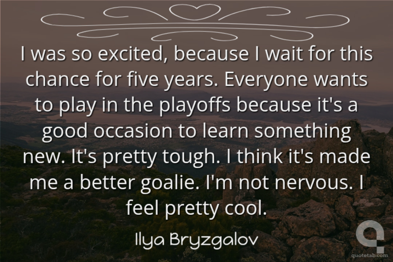 I was so excited, because I wait for this chance for five years. Everyone wants to play in the playoffs because it's a good occasion to learn something new. It's pretty tough. I think it's made me a better goalie. I'm not nervous. I feel pretty cool.