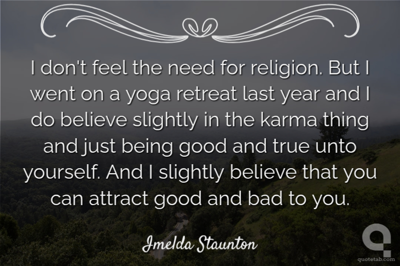 I don't feel the need for religion. But I went on a yoga retreat last year and I do believe slightly in the karma thing and just being good and true unto yourself. And I slightly believe that you can attract good and bad to you.