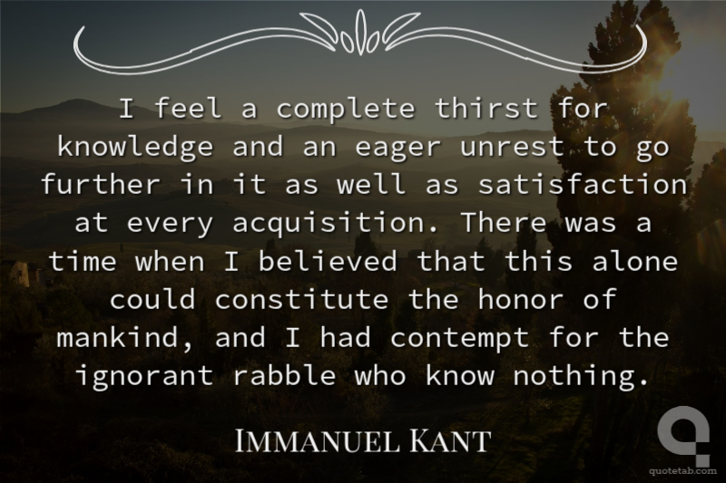 I feel a complete thirst for knowledge and an eager unrest to go further in it as well as satisfaction at every acquisition. There was a time when I believed that this alone could constitute the honor of mankind, and I had contempt for the ignorant rabble who know nothing.