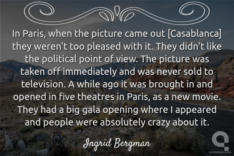 In Paris, when the picture came out [Casablanca] they weren't too pleased with it. They didn't like the political point of view. The picture was taken off immediately and was never sold to television. A while ago it was brought in and opened in five theatres in Paris, as a new movie. They had a big gala opening where I appeared and people were absolutely crazy about it.