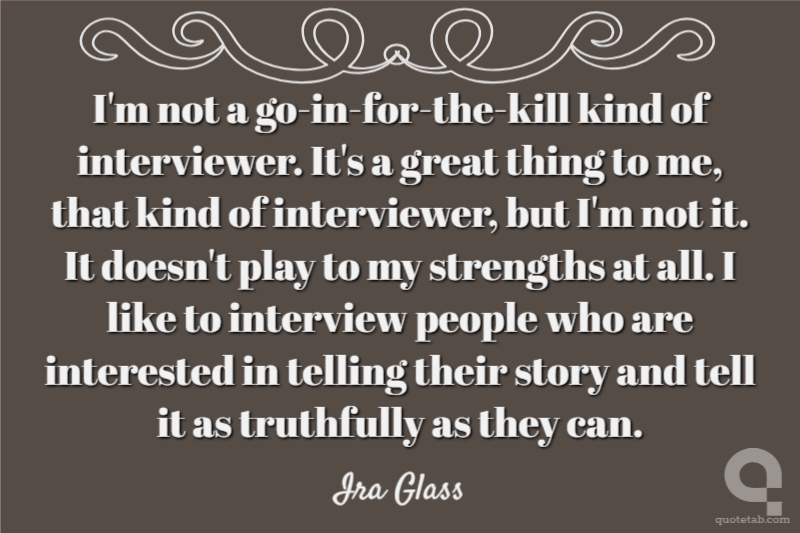 I'm not a go-in-for-the-kill kind of interviewer. It's a great thing to me, that kind of interviewer, but I'm not it. It doesn't play to my strengths at all. I like to interview people who are interested in telling their story and tell it as truthfully as they can.