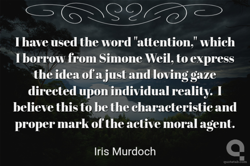 I have used the word "attention," which I borrow from Simone Weil, to express the idea of a just and loving gaze directed upon individual reality. I believe this to be the characteristic and proper mark of the active moral agent.