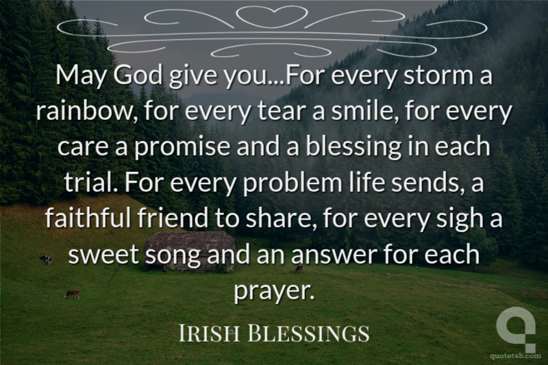 May God give you...For every storm a rainbow, for every tear a smile, for every care a promise and a blessing in each trial. For every problem life sends, a faithful friend to share, for every sigh a sweet song and an answer for each prayer.