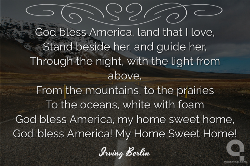 God bless America, land that I love, Stand beside her, and guide her, Through the night, with the light from above, From the mountains, to the prairies To the oceans, white with foam God bless America, my home sweet home, God bless America! My Home Sweet Home!