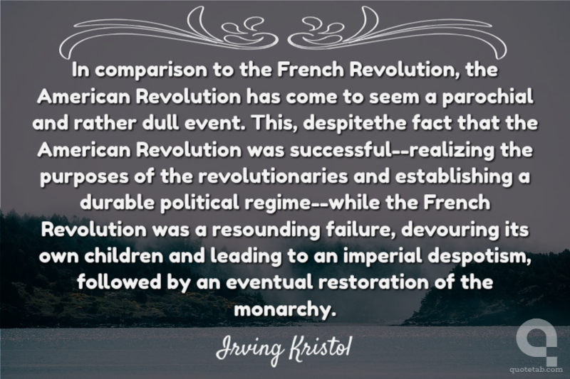 In comparison to the French Revolution, the American Revolution has come to seem a parochial and rather dull event. This, despitethe fact that the American Revolution was successful--realizing the purposes of the revolutionaries and establishing a durable political regime--while the French Revolution was a resounding failure, devouring its own children and leading to an imperial despotism, followed by an eventual restoration of the monarchy.