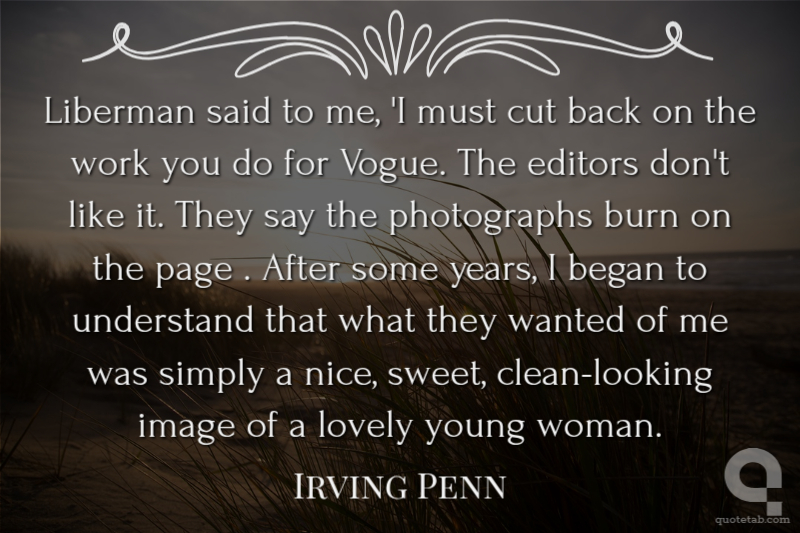 Liberman said to me, 'I must cut back on the work you do for Vogue. The editors don't like it. They say the photographs burn on the page . After some years, I began to understand that what they wanted of me was simply a nice, sweet, clean-looking image of a lovely young woman.