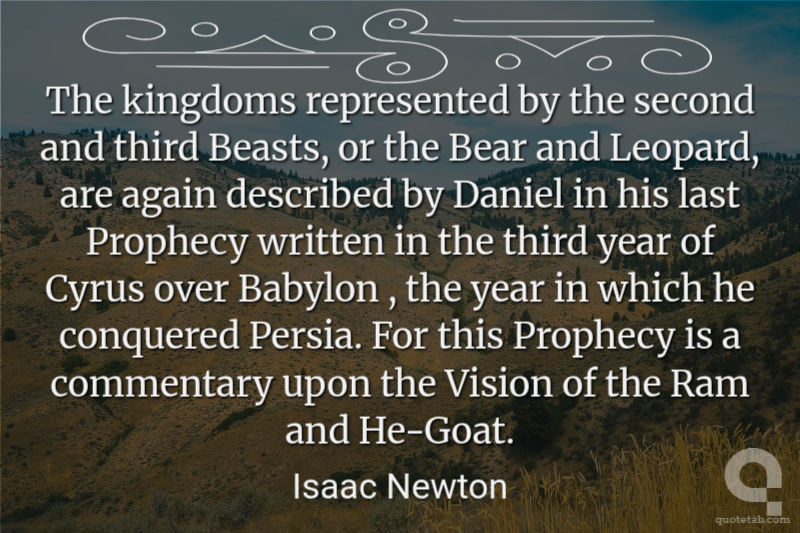The kingdoms represented by the second and third Beasts, or the Bear and Leopard, are again described by Daniel in his last Prophecy written in the third year of Cyrus over Babylon , the year in which he conquered Persia. For this Prophecy is a commentary upon the Vision of the Ram and He-Goat.