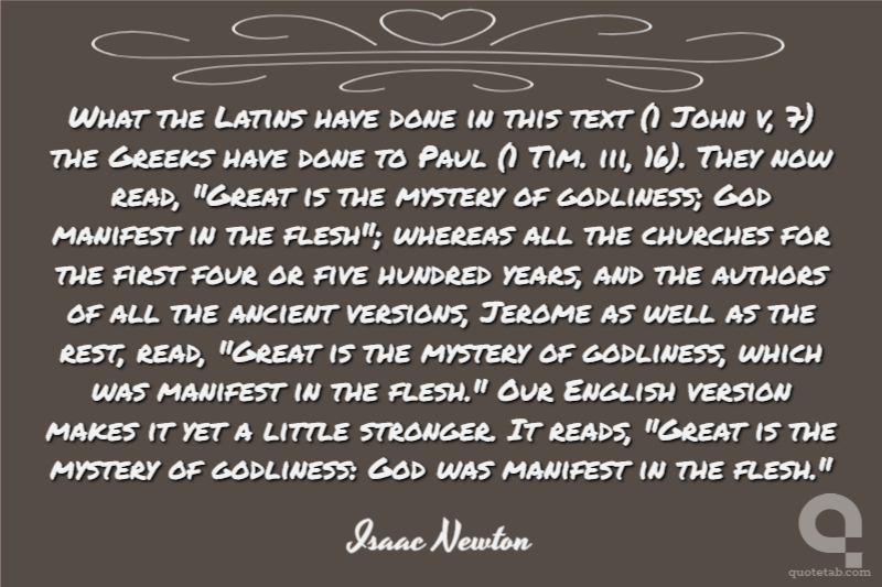 What the Latins have done in this text (1 John v, 7) the Greeks have done to Paul (1 Tim. iii, 16). They now read, "Great is the mystery of godliness; God manifest in the flesh"; whereas all the churches for the first four or five hundred years, and the authors of all the ancient versions, Jerome as well as the rest, read, "Great is the mystery of godliness, which was manifest in the flesh." Our English version makes it yet a little stronger. It reads, "Great is the mystery of godliness: God was manifest in the flesh."