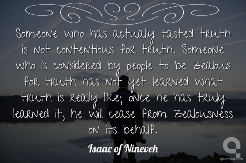 Someone who has actually tasted truth is not contentious for truth. Someone who is considered by people to be zealous for truth has not yet learned what truth is really like; once he has truly learned it, he will cease from zealousness on its behalf.