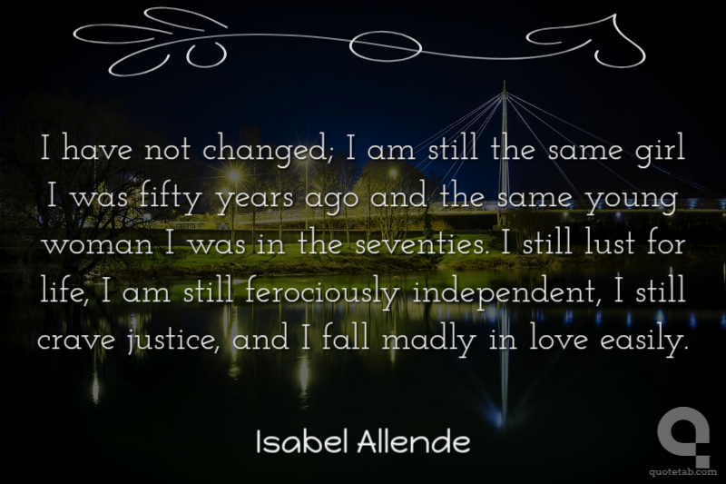 I have not changed; I am still the same girl I was fifty years ago and the same young woman I was in the seventies. I still lust for life, I am still ferociously independent, I still crave justice, and I fall madly in love easily.