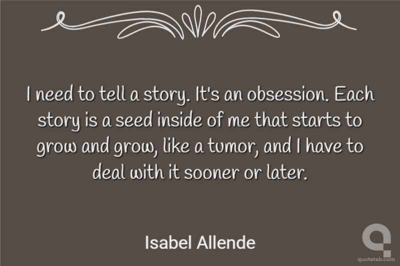 I need to tell a story. It's an obsession. Each story is a seed inside of me that starts to grow and grow, like a tumor, and I have to deal with it sooner or later.