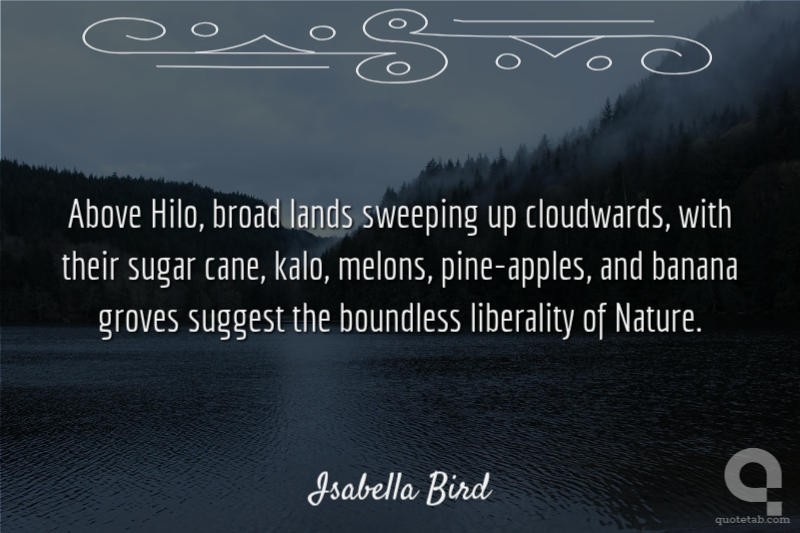 Above Hilo, broad lands sweeping up cloudwards, with their sugar cane, kalo, melons, pine-apples, and banana groves suggest the boundless liberality of Nature.