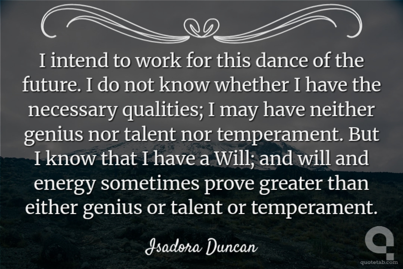 I intend to work for this dance of the future. I do not know whether I have the necessary qualities; I may have neither genius nor talent nor temperament. But I know that I have a Will; and will and energy sometimes prove greater than either genius or talent or temperament.