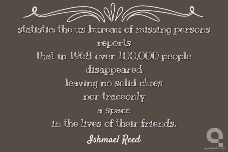 statistic: the us bureau of missing persons reports that in 1968 over 100,000 people disappeared leaving no solid clues nor traceonly a space in the lives of their friends.