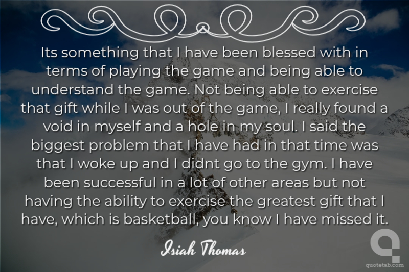 Its something that I have been blessed with in terms of playing the game and being able to understand the game. Not being able to exercise that gift while I was out of the game, I really found a void in myself and a hole in my soul. I said the biggest problem that I have had in that time was that I woke up and I didnt go to the gym. I have been successful in a lot of other areas but not having the ability to exercise the greatest gift that I have, which is basketball, you know I have missed it.